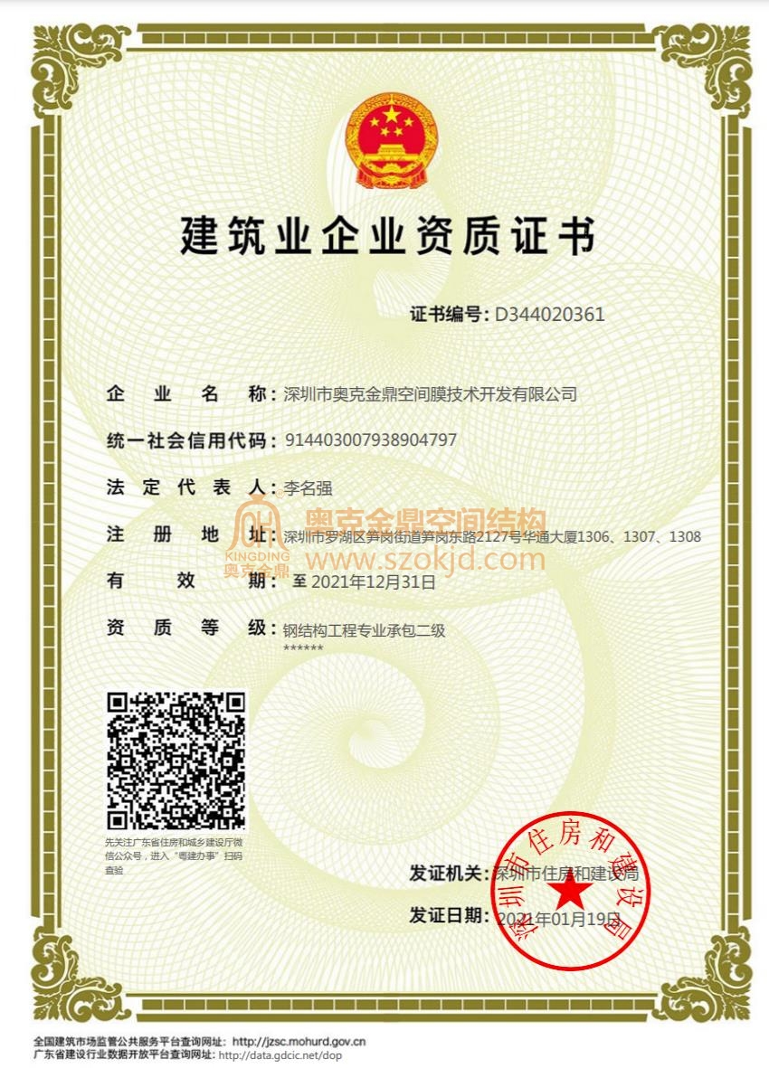鋼結構工程安裝貳級,膜結構工程設計壹級,膜結構工程施工壹級,具備安全生產許可證。